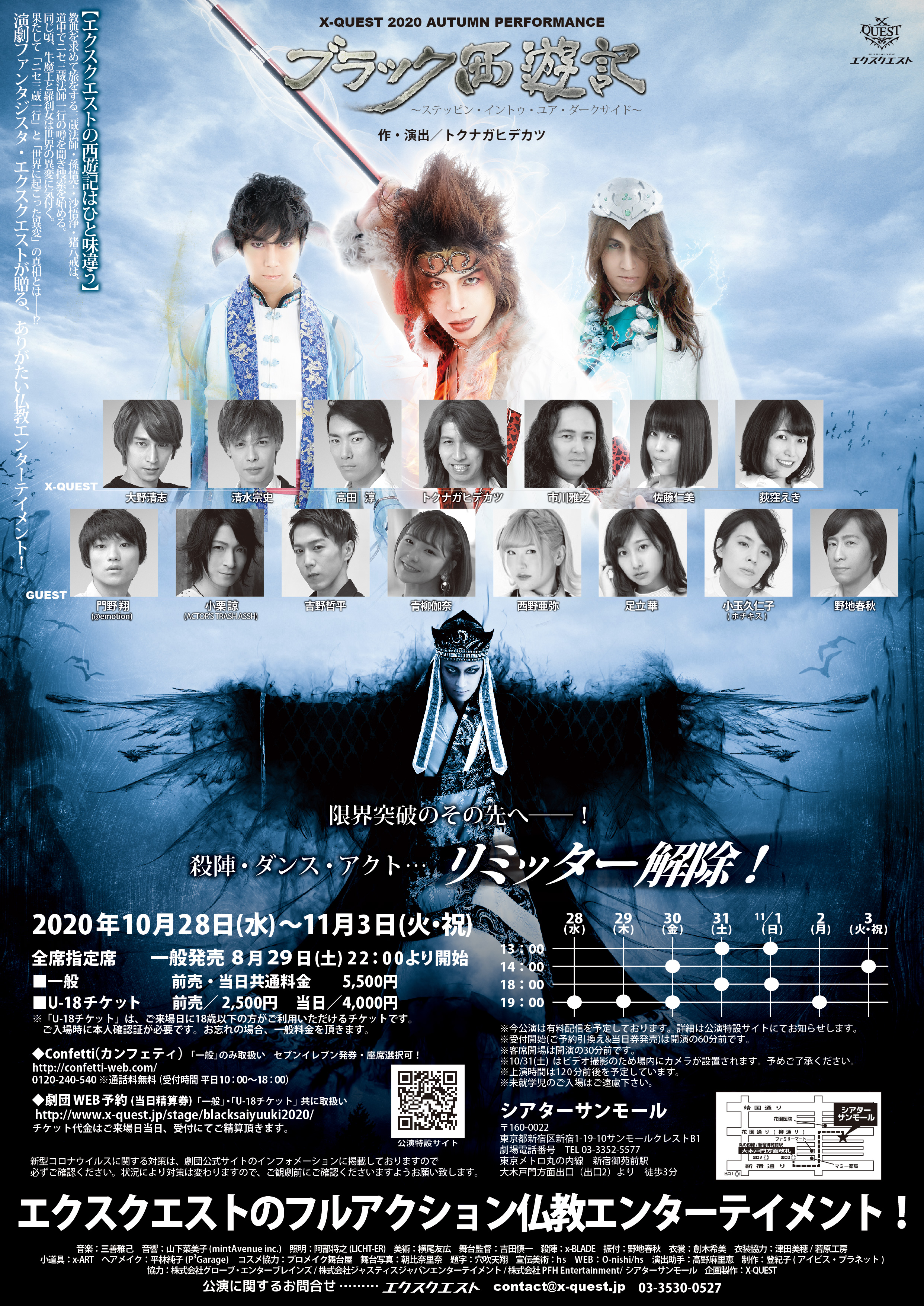 【エクスクエストの西遊記はひと味違う】 教典を求めて旅をする三蔵法師・孫悟空・沙悟浄・猪八戒は、 道中でニセ三蔵法師一行の噂を聞き捜索を始める。 同じ頃、牛魔王と羅刹女は世界の異変に気付く。 果たして「ニセ三蔵一行」と「世界に起こった異変」の真相とは──!? 演劇ファンタジスタ・エクスクエストが贈る、ありがたい仏教エンターテイメント!